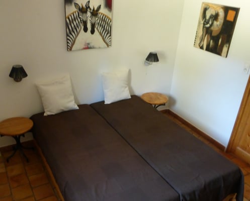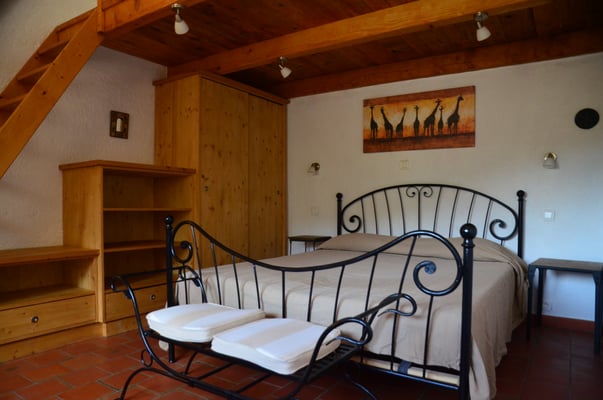 Un grand escalier permet d’atteindre la partie supérieure de la maison, où se trouve la deuxième chambre. Elle contient une armoire à vêtements, une table pliante avec deux chaises et se deux lits (0,80 x 2 m) soit vous l'utiliser individuellement ou comme lits doubles.