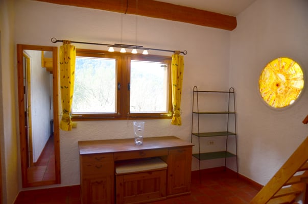Depuis le salon, on peut accéder directement à la chambre du bas équipée d‘une armoire spacieuse, d’un bureau